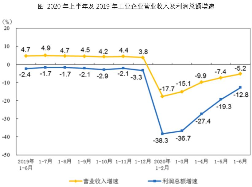 上半年,规模以上工业企业实现营业收入46.31万亿元,同比下降5.2%;实现利润总额25114.9亿元,同比下降12.8%,降幅比1~5月份收窄6.5个百分点;营业收入利润率为5.42%,同比降低0.48个百分点。