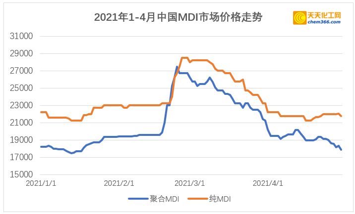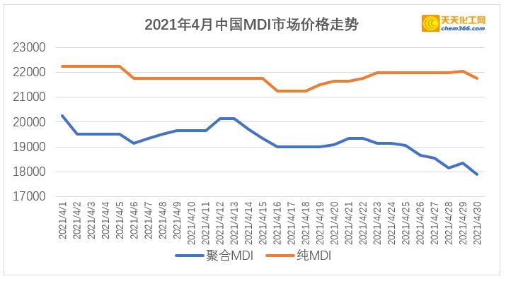在经历了二月的“大起”和三月的“大落”后,四月的国内mdi市场行情,可用“波澜不惊”来形容。整个四月期间,纯mdi在21000-22500元/吨横盘,聚合mdi从月初的20000元/吨出头,偏弱震荡至17800元/吨左右。