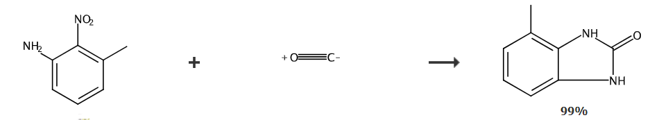 在容积为70毫升的不锈钢高压釜中加入10mmol的3-甲基-2-硝基胺(通式中r为给电子的取代基),0.5mmol的硒粉、10mmol的三乙胺和10g,密封,充入一氧化碳3.0mpa,放入油浴中,迅速升温至150℃,保温下反应4h,冷却至室温,打开釜,将过滤所得的固体与母液浓缩所得的固体合并,干燥,称重得产品4-甲基并咪唑酮,反应粗产物采用乙醇作为溶剂,用反应粗产物在所述溶剂接近沸点温度时完全溶解时的添加量,进行重结晶提纯。纯度几乎为100%,收率为99.3%。