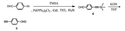 将对溴甲醛(1.85g,10mmol)溶解于15ml的无水thf中,加入三甲基硅基乙炔(1.47g,15mmol),双三基磷二氯化钯(70mg,0.1mmol),碘化亚铜(38mg,0.2mmol),以及5ml三乙胺。于40℃反应2h。旋干thf,以pe和dcm(体积比2∶1)为洗脱剂过柱纯化,得到2.0g化合物4,白色固体。产率为99%。