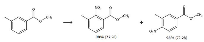 在100ml圆底烧瓶中加入4.8ml65%硝酸(0.07mol),滴加7.6ml(0.08mol)酐,滴完,反应0.5h后,将7.6ml酐、5.4ml、3.0g3-甲基甲酸甲酯(0.02mol)混合后,缓慢滴加到反应体系中,以上操作均在冰浴条件下进行。滴完后,升温至30℃反应3h,停止反应后,蒸出酐,硝酸及生成的冰醋酸,将浓缩液倒入冰水中,搅拌,有黄色固体析出,加入20ml将附着在瓶壁上的产物溶解,分液,浓缩,得浅黄色液体3.83g,收率98.21%。经hplc分析,3-甲基-2-硝基甲酸甲酯与3-甲基-4-硝基甲酸甲酯的含量比为72:28。