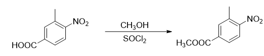 在干燥的装有回流冷凝管和温度计的3l三口瓶中加入300g3‑甲基‑4‑硝基甲酸(1.66mol)和1000ml甲醇,于回流冷凝管上制作一简易尾气吸收装置,吸收液为naoh水溶液。电磁搅拌下用恒压滴液漏斗逐滴加入100g二氯亚砜(0.85mol),控制滴加过程中反应液的温度在30‑40℃之间,此时反应液为乳白色溶液。约45min滴加完毕,加热升温至60℃,此时反应物呈黄色澄清透明溶液。在此温度下搅拌回流反应2h,停止加热,反应液缓慢冷却,至50℃时析出大量固体。继续冷却降至30℃,将1000ml水加入反应液中,搅拌约半小时至不再有气体放出,过滤反应物,所得滤饼用100ml×3水洗涤,于40℃烘干得314g黄色粉末状固体,产率97.2%,m.p.80~82℃。