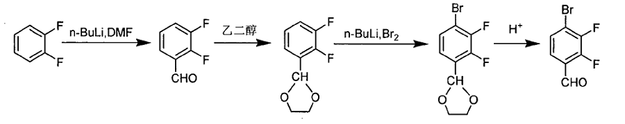 4)取中间体4‑溴‑2,3‑二氟甲醛缩乙二醇,与20%稀反应11‑13h后,取有机层加入适量氯仿稀释,经水洗、重结晶后得目标产物4‑溴‑2,3‑二氟甲醛。