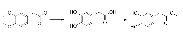 3,4-二羟基甲酯可用于制备羟基酪醇。羟基酪醇,其化学名为3,4-二羟基乙醇(3,4-dihydroxyphenylethanol),是一种羟基芳族(hydroxyaromatic)化合物。自然界中天然的羟基酪醇很少以游离的形式存在,仅发现在橄榄果的成熟过程中由β-糖苷酶和酯酶酶解橄榄苦苷得到。羟基酪醇是一种多酚类天然产物,其邻二酚羟基的强抗氧性和清除自由基能力,使之具有一些有益于人体健康的生物活性,如抗肿瘤、抑菌、抗炎,以及对心脑血管和糖、脂代谢疾病的预防作用。