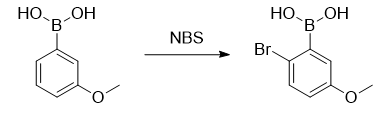 在氩气气氛下,将300毫升茄形烧瓶中加入3-甲氧基基硼酸(9.12g,60.0mmol),三膦硫化物(932mg,6.00mmol),二氯甲烷(200ml),将其搅拌以形成均匀溶液。向其中加入n-溴琥珀酰亚胺(13.0g,72.0mmol),并将混合物在室温搅拌2天。向反应混合物中加入饱和硫代钠水溶液以终止反应,然后用二氯甲烷(100ml×3)萃取。合并的有机层用饱和盐水洗涤,然后经钠干燥。过滤后,将其减压浓缩以获得粗产物。将其通过硅胶柱色谱法(290g,正己烷/丙酮=1/1)纯化,得到2-溴-5-甲氧基基硼酸(8.45g,36.6mmol),产率61.0%)。
