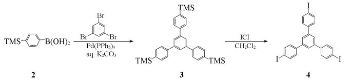 1,3,5-三(4-碘基)是一种有机中间体,可由1,3,5-三溴和对三甲基硅基硼酸通过两步制备得到。有文献报道1,3,5-三(4-碘基)可用于设计和开发高性能的光电器件、分子识别、锂电池和储氢材料等有机分子功能材料。