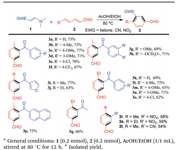 [1] yang, lu, wei, et al. redox neutral [4+2] benzannulation of dienals and tertiary enaminones for benzaldehyde synthesis[j]. chemical communications, 2018.