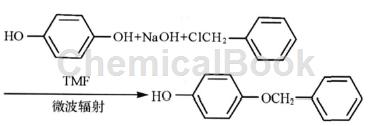 在100ml锥形瓶中加入2.63g(0.028mol)对二酚,称取1.12g(0.028mol)氢氧化钠,加入8ml水,待氢氧化钠溶解后滴加至盛有对二酚的锥形瓶中,充分摇匀,再加入15mldmf和2.52g(0.02mol)氯化苄,在微波辐射功率为320w的条件下,辐射反应60s。反应结束后冷却至室温。先用10%的氢氧化钠调至碱性,抽滤,滤饼用10%的氢氧化钠洗涤至滤液呈无色(滤饼为氢醌双苄醚,可回收利用)。滤液用盐酸酸化使莫诺宗完全析出,再经抽滤及冰水洗涤后,用醇、水重结晶,活性炭脱色,得2.55g白色固体,收率为63.79%。