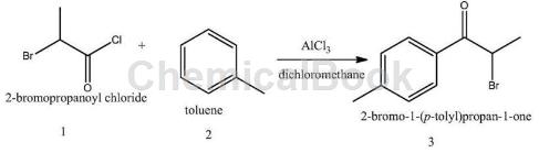 2-溴-4'-甲基丙酮制备如下:(1)在氩气保护下,向反应瓶中加入(4g,30mmol)无水氯化铝,然后加入无水二氯甲烷20ml,搅拌使其溶解。溶解以后加入(1.7g,10mmol)2-溴丙酰氯,继续搅拌20min。然后加入(0.92g,10mmol),30min内滴加完成。滴加完成以后,回流2h,回流完成以后冷却到室温。冷却以后将溶液倒入40ml冰水中,并且加入20ml二氯甲烷和20ml6n盐酸,剧烈摇晃以后静止分层。分层以后留下下层的二氯甲烷相,用1nhcl洗涤二氯甲烷相2次后,再用无水镁干燥,过滤,旋蒸得到透明油状物质。透明物质置于结晶皿中并且加溶解,然后缓慢滴加石油醚至略有浑浊,加盖并且夹一张纸片静止于通风橱中结晶,得到1.37g产物2-溴-4'-甲基丙酮透明晶体。收率60.6%13cnmr(dmso)δ:192.562,144.674,134.845,129.242,129.025,41.009,22.502,20.963esim/z=227(m+1)。