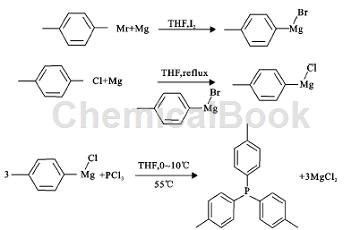 关于它的制备已有了很多相关的报道.文献以三(对基)膦为原料还原法得到,虽然还原法的产率相对高,高可达90%,但是原料成本高,比产品自身价格高,且反应过程中用乙腈作溶剂,毒性大;以对甲基基锂和三氯化磷为原料进行亲反应制得,该方法用对甲基基锂作原料,但锂试剂制备条件苛刻,而且价格比格氏试剂贵;用对溴作原料,通过格氏反应及亲核反应制得,但对溴的价格是本研究中所用的对氯的8倍,分子量是对氯的1.36倍,总体原料成本约是对氯的11倍且用溴做原料有较多的格氏偶联副产物;直接以对甲基基氯化镁和三氯化磷的亲核反应制得,该法在反应过程中用到催化剂(cl4cu)2-2li+,成本比较高,且对氯是甲基基氯化镁的原料,用对氯作原料可以节约更多成本.格氏试剂的制备条件苛刻,水的影响仅对小反应影响比较重要(特别是mmol级别的),因为都是在氮气保护条件下和回流条件下制备,所以对1l的反应,水的影响就比较小。