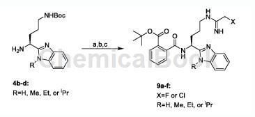 向搅拌的4b-d(1.0eq)在dmf中的溶液中加入hobt(2.0eq),hbtu(2.0eq)和dipea(3.0eq),然后加入邻二甲酸氢叔丁酯(1.0eq),并在室温搅拌12小时。然后将反应混合物用水稀释。过滤产物,用水洗涤,真空干燥,以62-71%的产率获得。然后将该产物用1mhcl的etoac溶液处理,以除去boc基团,得到co2tbu-bz-orn-并咪唑中间体。然后将溶剂蒸发至干,并将粗物质真空干燥。向相应的co2tbu-bz-orn-并咪唑中间体在无水meoh中的搅拌溶液中,加入tea(4.0eq),然后加入卤代乙亚氨酸乙酯hcl(2.0eq)。将反应在氮气下于室温搅拌3小时。然后在减压下蒸发溶剂,并通过反相hplc使用mecn:h2o(0.5%tfa)作为洗脱剂纯化粗产物,以51-67%的产率得到化合物9a-f。该化合物可作为pad的新型抑制剂或灭活剂,可用于治疗免疫系统疾病和炎性疾病和病症(例如类风湿性关节炎,狼疮)。