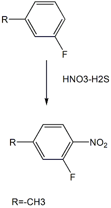 3-氟-4-硝基可用作医药合成中间体。如其可用于制备2-氟-4-甲基溴:将100g的2-氟-4-甲基硝基溶于500cm3的乙醇中,加入1.6g的5%的钯碳,并在剧烈搅拌下吸收氢气。玫瑰过滤反应产物以除去钯碳,并蒸馏出滤液中的乙醇。在减压下(沸点71℃/10mmhg)蒸馏剩余的油,得到73.5g的2-氟-4-甲基胺。将73.5g的2-氟-4-甲基胺溶解在通过用280cm3的水稀释280cm3的48%氢溴酸得到的溶液中。在冰浴上,将通过将42gnano2溶解在5℃或更低的90cm3的水中而制备的溶液添加到该溶液中。将重氮盐溶液滴加到在搅拌下将100g cubr溶于48%氢溴酸中而获得的溶液中,然后在室温下搅拌过夜。用氯仿萃取反应溶液,并用48%氢溴酸和水洗涤。蒸出氯仿,减压下(沸点68℃/10mmhg)蒸馏残留的油状物,得到94g的2-氟-4-甲基溴。