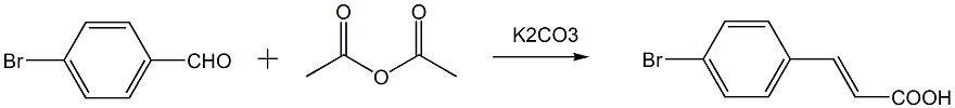在装有回流冷凝管和干燥管的三口烧瓶中加入当量比为1:4:1.5的4-溴甲醛、醋酸酐和无水碳酸钾(或无水碳酸钠、无水碳酸氢钠),在130~140℃搅拌回流,待原料4-溴甲醛反应完,停止反应;配制20%的氢氧化钠水溶液,待体系冷却到80~90℃时,将ph调至8~10,待体系冷却至室温加入少许活性炭,煮沸并趁热过滤,得滤液1,将滤饼转移至原反应的三颈瓶中并加入水,加入氢氧化钠溶液将ph调至8~10,在100℃下加热2h后趁热过滤,得滤液2;将滤液1和滤饼2合并,冷却,向滤液中缓慢滴加浓盐酸,将ph调至4,静置过夜待充分析出,抽滤,滤饼水洗,干燥,称重,得(e)-3-(4-溴基)丙烯酸;