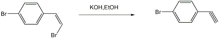 在单口烧瓶中加入无水乙醇(或无水甲醇)和当量比为1:3的(z)-1-(4-溴基)-2-溴乙烯和氢氧化钾(或氢氧化钠),加热至70℃反应,监测至反应完全后停止反应;将反应混合物冷却至室温,减压除去乙醇,向体系中加入冰水,密封置于冰箱中静置过夜,待目标产物充分析出,抽滤,滤饼水洗后,产物经过升华得对溴乙炔。