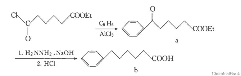 在装有冷凝回流管的500ml四口瓶中加入一缩二乙二醇100ml(1.05mol),5-甲酰基戊酸乙酯23.4g(0.1mol),80%水合肼30ml。混合加热回流2h后,降温装上分水装置,在180℃以下蒸出并收集水和未反应的水合肼,停止加热,待反应物冷却后向体系中加入含8g(0.2mol)80%氢氧化钠水溶液,在210℃以下加热反应,同时收集反应生成的水,待反应升至210℃撤去分水装置,回流3h后冷却至室温,用冷的稀盐酸酸化混合物,直到不再生成新的沉淀为止,抽滤得产品已酸。