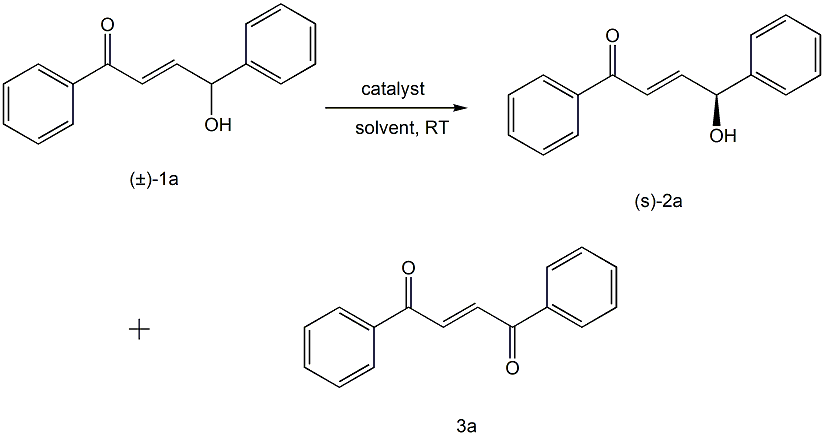 以消旋烯丙基仲醇(±)-1a为原料,在手性联萘酚钾盐催化作用下,有机溶剂中反应得到手性烯丙基仲醇2a和1,2-联甲酰乙烷3a。反应条件优化结果如下: