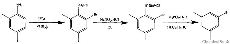 3,5-二甲基溴是一种重要的化工中间体。高纯度的3.5-二甲基溴可以用于电子化学领域,市场前景广阔。如制备二(3,5-二甲基基)氧化磷,农用除草剂s-异丙基甲草胺的加氢催化剂双膦配体的中间体,先将mg、四氢呋喃和碘混合全,加入少量3,5-二甲基溴,加热引发反应,混合体系温度上升至50℃~60℃后,降温加入大量3,5-二甲基溴,加热使混合体系45℃~50℃的条件反应至反应结束后,再降温滴加亚磷酸二乙酯,搅拌反应至结束;然后采用盐酸调反应后体系的ph=1,再加入萃取分层,取有机层脱溶得白色固体,用环己烷重结晶得二(3,5-二甲基基)氧化磷。本发明省去了注层析等操作步骤,增大产能,提高收率,降低能耗,降低生产成本。