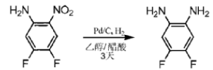 将4,5-二氟-2-硝基胺(10g,57.4mmol),10%pdoncarbon(1g)和100ml甲醇混合在一起,加入到一个充满氮气的反应瓶内。然后加入20ml,通氢气分钟。然后将反应置于室温下反应3天,经过滤除去pd催化剂,收集滤液,并对滤液经行减压蒸馏,然后加入氯仿将残余物溶解,经饱和na2co3溶液反复3次萃取后,用mgso4干燥有机相,过滤,收集滤液,蒸除溶剂,得到棕黄色固体。1hnmr(400mhz,cdcl3):δ6.51(t,2h),3.33(br,4h).