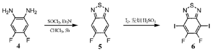 2)将0.89g化合物5(5mmol)、5g碘(,20mmol)和25ml发烟混合于一圆底烧瓶内,60°c下搅拌1天。待反应体系的温度恢复到室温后,将反应混合物倒入300ml冰水混合物中。用氯仿萃取三次后合并有机相,然后用饱和naoh溶液和nahco3饱和溶液洗涤有机相,用mgso4干燥,过滤,收集滤液,蒸除溶剂,得到黄色针状晶体。
