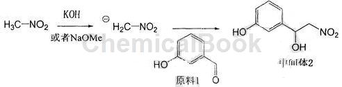 a、以甲醇钠或氢氧化钾为碱,在0℃下慢慢滴加入硝基甲烷,温度0℃搅拌15-60分钟,形成浅黄色负离子悬浮液,再将间羟基甲醛先溶于硝基甲烷后,缓慢滴加悬浮液中,升至室温,搅拌,加入饱和氯化铵溶液终止反应,用提取反应液,合并有机相,用饱和食盐水洗涤,经无水钠干燥,浓缩后得到浅黄色油状物,经柱层析纯化得到浅黄色固体中间产物3-(1-羟基-2-硝基)乙基酚,反应式为: