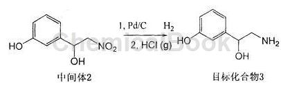 b、将中间产物3-(1-羟基-2-硝基)乙基酚,溶于无水甲醇中,加入钯碳催化剂,室温常压加氢催化氢化,搅拌10-20小时,通过硅藻土过滤,滤液浓缩得到粗品。