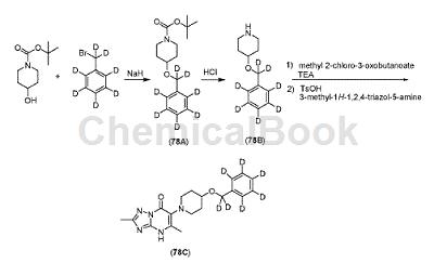 wo2018229683报道了α-溴-d7可用于制备2,5-dimethyl-6-(4- ((phenyl-d5)methoxy-d2)piperidin-1-yl)-[1,2,4]triazolo[1,5-a]pyrimidin-7(4h)-one。该化合物对动素体原生动物具有抑制抗寄生虫活性。通过抑制寄生性蛋白酶体而抑制运动型质体寄生虫细胞生长,并且其可用作利什曼病和查加斯病的疗法。