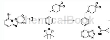 n-[5-[4-[(1,1-二氧代-4-硫代吗啉基)甲基]基][1,2,4]三唑并[1,5-a]吡啶-2-基]环丙烷甲酰胺的制备(8a):将4-(4-(4,4,5,5-四甲基-1,3,2-二氧杂戊硼烷-2-基)-苄基)硫代吗啉1,1-二氧化物(中间体1a)(20.18g,53mmol)、n-(5-溴-[1,2,4]三唑并[1,5-a]吡啶-2-基)环丙烷甲酰胺(中间体7a)(16.45g,59mmol)、pd(dppf)cl2(3.91g,5mmol)、k2co3(22.06g,160mmol)依次加到250ml三口瓶中,然后加入1,4-二氧六环(100ml)、水(25ml),氩气保护下升温至90℃反应12小时。反应结束后,冷却至室温,向反应液中加300ml二氯甲烷,然后用水洗涤两次,每次500ml,无水钠干燥有机相,有机相浓缩至干,残余物通过柱层析色谱法(洗脱剂:二氯甲烷:甲醇=50:1)纯化,得标题产物n-[5-[4-[(1,1-二氧代-4-硫代吗啉基)甲基]基][1,2,4]三唑并[1,5-a]吡啶-2-基]环丙烷甲酰胺,浅黄色固体11g。