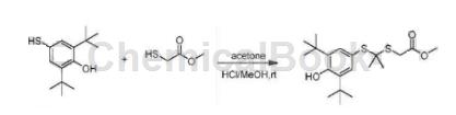 在0℃下,将2-巯基甲酯(1ml)和2,6-二-叔丁基-4-巯基酚(0.88g,3.7mmol)加入到干燥的丙酮(20ml)中,然后慢慢加入meoh(20ml),随后慢慢通入hcl气至ph到2~3,。反应液在室温下反应过夜,减压除去有机溶剂,残留物加入etoac(100ml),分别用饱和nahco3和食盐水洗,无水钠干燥。粗产品过层析柱(硅胶,etoac:pe=1:20到1:5),得产品甲基2-((2-((3,5-二-叔丁基-4-羟基)噻)丙基-2-基)噻)酯(444mg,收率22%),无色液体,室温下慢慢固化。