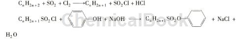 由 c12~c18的重液体石蜡用发烟进行脱水处理后,经流量计计量通入二氧化硫和氯气,进行磺酰氯化。反应在光照下进行,反应温度 30 ℃左右,转化率达50%左右,从产物中除去残留的氯化氢后与酚在烧碱存在下进行酯化,反应温度约50 ℃,生成烷基磺酸酯。酯化物经静置分离水层后用20%的烧碱在70 ℃左右萃取酚,然后经通入热蒸气进行减压蒸馏脱去未反应的烷烃,塔釜温度190 ℃~210 ℃,真空度不低于0.085 mpa。粗酯经次氯酸钠脱色、水洗、真空脱水、抽滤,即得成品。反应式如下: