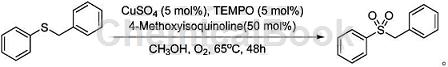 砜类化合物是一类具有广泛应用的有机化合物,其所含有的磺酰基广泛存在于药品、农用化学品和功能材料等各种化学物质中。使用硫醚选择性氧化是合成砜类化合物常用的方法之一。苄基基砜可用作医药合成中间体。在现有硫醚选择性氧化为砜类化合物的研究中,常用酸、金属氧化物、有机过氧化物、无机过氧化物、卤素等作为氧化剂,这些氧化剂的用量一般都是过量的,且存在着不易控制、不易分离等缺点。氧气作为理想化的氧化剂一直以来都是研究的热点,然而氧气为氧化剂催化硫醚选择性氧化为砜类化合物的研究还存在许多问题,如加入大量的醛作为牺牲剂,催化剂合成复杂、成本高,应用范围窄等。