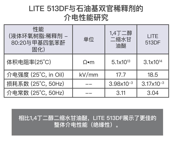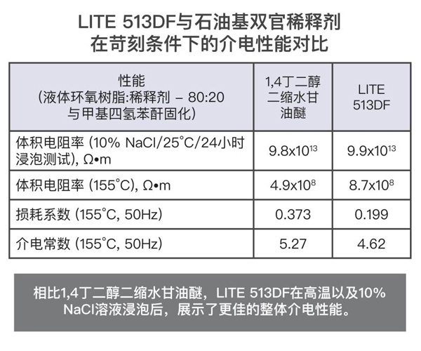 根据iec 62631和iec 60243标准进行测试,如其介电性能所示,lite 513df提供了良好的绝缘性能。在epon 828的配方中,树脂的使用量为20%,用mthpa(甲基四氢邻二甲酸酐)固化,并用bdma(苄基二甲胺)催化。lite 513df展示了优异的结果,其体积电阻率和介电强度更高,损耗因数和介电常数比竞品1,4丁二醇二缩水甘油醚更低。当两种稀释环氧树脂体系都暴露于高温或盐溶液中时,lite 513df的性能优于石油基双官能稀释剂。lite 513df是一款良好的环氧稀释剂和改性剂,适用于电气灌封、铸造和封装(浸渍树脂)。