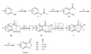5-氯-3-并呋喃酮的制备如下:酚衍生物(0.5mol)(r:5-氯)与酐(0.6mol)一起回流吡啶30分钟,然后反应混合物用冷却后的水处理,过滤沉淀,用适当的溶剂萃取固的材料。将得到的酯衍生物(ⅰ)(0.4摩尔)置于油浴中,与的烧瓶中的alcl3(0.48mol)反应,在离开油浴后倒入粘稠的混合物,放入冰水中晒干,得20-羟基乙酮衍生物(ii)。将化合物ii(0.3mol)与一起搅拌在50-100℃下加入酸酐(0.45mol)3-4小时,为了防止羟基的反应能力将其乙酰化。获得20-乙酰氧基乙酮衍生物(iii)(0.25mol);将化合物用br2(0.3mol)的或溴化得20-乙酰氧基-2-溴乙酮衍生物(iv);然后将其用10%hcl酸(300ml)水解,得到20-羟基-2-溴乙酮(v)。后,从化合物v及钠(0.6mol)在乙醇中的回流条件下环化反应,过滤,然后结晶,得到5-氯并呋喃-3-酮(a3):87-89℃。