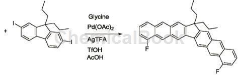 将9,9-二丁基-2,7-二碘芴共53mg(0.1mmol)与2-氟-6-甲基甲醛34.5mg(0.25mmol),甘氨酸7.5mg(0.1mmol),醋酸钯2.25mg(0.01mmol),三氟银53.1mg(0.24mmol)和三氟甲磺酸15mg(0.1mmol)混合在2ml冰醋酸溶剂中,将反应液放在100℃的磁力搅拌器上搅拌,反应24h后,对反应液点板,判断反应是否反应完全,或者某一反应物已经全部反应,停止反应。向反应液中加饱和碳酸氢钠水溶液和二氯甲烷萃取后取下层萃取液,再加适量无水钠干燥除水,过滤后取滤液,后加硅胶粉旋干二氯甲烷,其中硅胶粉的质量是滤液中溶质的质量的30-40倍。通过柱层析法提纯产物,再旋干溶剂,抽真空得到并芴结构的稠环芳烃44.2mg,产率86%。