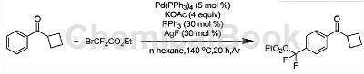1)在反应管中加入环丁基基甲酮0.0320克(0.2mmol)、四三基膦钯0.0116克(0.01mmol)、醋酸钾0.0786克(0.8mmol)、三基膦0.0157克(0.06mmol)、氟化银0.0077克(0.06mmol)、溴二氟0.0203克(1.00mmol)和0.25ml正己烷,充入氩气保护,140℃反应20小时;