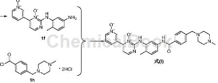 将1f(1.83g,0.006mol)投入100ml三口瓶,加入纯化水(31ml),搅拌降至内温0~3℃,分批加入4-(4-甲基哌嗪甲基)甲酰氯二盐酸盐(3.9g,0.015mol),室温搅拌2小时,过滤,滤液加入丙酮(16ml),加热至45~50℃,滴加氨水,直至浊点出现,冷却至室温,搅拌析晶2小时,抽滤,用纯化水洗涤(10ml×2),75~80℃真空干燥2小时,得到黄色固体状的4-[(4-甲基-1-哌嗪基)甲基]-n-[4-甲基-3-[[4-(1-氧-3-吡啶基)-3-氧-2-嘧啶基]氨基]基]甲酰胺式(i)2.29g,收率73%,hplc:99.2%。