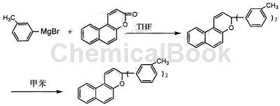 向间基溴化镁中滴加溶于16ml无水四氢呋喃的0.01mol由上述步制得的萘并吡喃-2-酮,滴加完毕继续回流6小时,tlc跟踪监测,直至原料点消失,停止反应,蒸除四氢呋喃,加入质量百分比浓度为22%的氯化铵水溶液,水解未反应的格林试剂,加入萃取,用无水镁干燥,过滤由此形成的溶液,避光回流4小时,蒸去,用柱层析分离,制得2,2-二(3-甲基基)萘并吡喃光致变色化合物,产率为50%。