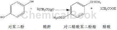 对二乙酰氧基的制备如下:打开配料釜投料口,人工将已称量好的对羟基甲酸、对二酚、6-羟基-2-萘甲酸以约10:2:7的比例加入投料釜中,再将氨基磺酸(催化剂)加入投料釜中,醋酐直接泵入投料釜,搅拌并使用夹套蒸汽升温到60度后放料至乙酰化釜,搅拌,利用电导热油锅炉夹套导热油升温到140度左右回流反应4小时,乙酰化结束后,通小流量氮气开始蒸馏出生成物醋酸,蒸馏过程中持续通入微量氮气,直至温度为160度左右,醋酸基本蒸馏结束,得产物氢胺(氢化安息香)。出酸过程中产生的醋酸经冷凝收集后作为副产品外卖。本反应以对羟基甲酸、对二酚和6-羟基-2-萘甲酸计,醋酐稍过量,对羟基甲酸、对二酚和6-羟基-2-萘甲酸基本完全反应,反应收率100%,无副反应。反应方程式如下: