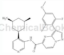 具体步骤为:叔丁基[(1s,3r,5s)-3-(3-{[(3-溴吡唑并[1,5-a]嘧啶-5-基)羰基]氨基}吡啶-4-基)-5-甲基环己基氨基甲酸酯,2,6-二氟-3-甲氧基硼酸(20.4 mg,0.0756 mmol),二环己基(2',4',6'-三异丙基联-2-基)膦-(2'-氨基联-2-基)(氯)钯(1:1)(3.3 mg,0.0042 mmol)将磷酸氢三钾水合物(23.9mg,0.104mmol)的1,4-二恶烷(0.51ml)/水(0.17ml)溶液在80℃,n2气氛下搅拌1.5小时。将反应混合物用dcm稀释并用水洗涤。减压浓缩有机层。通过制备型hplc(xbridge tm c18柱,用含有0.05%tfa的mecn /水的梯度,以60ml / min的流速洗脱)纯化残余物,得到boc保护的中间体。将化合物用1:1 dcm / tfa(2ml)处理2小时。减压除去挥发性溶剂,将得到的残余物溶于meoh中,并通过制备型lcms(xbridge tm c18柱,用含有0.1%氢氧化铵的mecn /水的梯度,以60ml / min的流速洗脱)纯化。得到标题化合物,为白色固体(4.3mg,18%)。