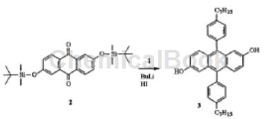步骤1:向2l圆底烧瓶中加入2,6-二羟基蒽醌(80.0g,0.33mol),咪唑(108.8g,1.6mol),叔丁基二甲基甲硅烷基氯(115.5g,0.77mol)和dmf。600毫升。将深红色混合物加热至90℃并保持3小时。tlc表明反应完成。将反应冷却并倒入2l冷水中。滤出深绿色针状沉淀物并用水和甲醇洗涤。将深绿色晶体溶解在中,滤出黑色不溶部分。浓缩亮黄色滤液,将粗产物悬浮在沸腾的甲醇中。过滤黄色沉淀,得到85.1g纯产物,为黄色丝状晶体,产率54%。1hnmr(cdcl3)δ(ppm):0.28(s,12h),1.00(s,18h),7.14(dd,j1=8.5hz,j2=2.5hz,2h),7.64(d,j=2.5hz,2h),8.17(d,j=8.5hz,2h)。13cnmr(cdcl3):-4.36,25.53,117.35,125.34,127.57,129.73,135.73,161.26,182.17。熔点131-133℃。fd-ms:m/z468(m+)。