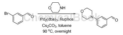 向500ml圆底烧瓶中加入3-溴甲醛(6.44g,35.0mmol,1.00当量),吗啉(9.13g,105mmol,3.00当量),三(二亚苄基丙酮)二钯(1.81克,1.75毫摩尔,0.05当量),二环己基(2',6'-二异丙氧基联-2-基)膦(3.26克,7.00毫摩尔,0.20当量),碳酸铯(34.2克,105毫摩尔)在氮气下,3.00当量),(100ml)。将所得溶液在90℃下搅拌过夜,并用水(50ml)淬灭。用二氯甲烷(3×200ml)萃取所得溶液,合并有机层,用盐水(3×100ml)洗涤,用无水钠干燥,过滤并减压浓缩。将残余物在硅胶柱上用/石油醚(3/17)进行色谱分离,得到3-吗啉基甲醛(2.10g,32%收率),为黄色油状物。