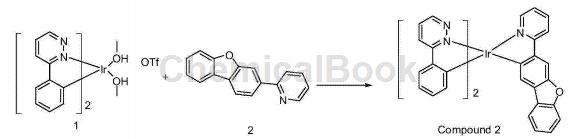cn201510906440.8报道了3-溴二并[b,d]呋喃可用于合成一种含3-基哒嗪结构的磷光铱配合物2。本铱配合物以金属铱为内核,作为发光层的磷光掺杂材料制成的oled器件可实现高亮度,高效率,低电压的效果。反应分三步如下: