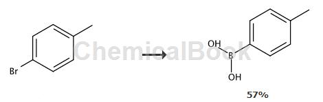 在250ml的双颈瓶中加入处理过的mg条(2.15g,90mmol),2粒碘,氮气保 护,抽真空3次。在加热条件下用注射器缓慢加入化合物对甲溴(化合物1, 60mmol)的无水thf溶液,反应引发后处于回流状态,继续加入剩余溶液,加完后回流反应5小时,得到对溴的格式试剂(化合物2),冷却至室温后,将反应装置转移到低温反应仪中,温度调节至-20℃,5分钟后用注射器加入硼酸三甲酯(9.36g,90mmol)的无水thf溶液,加完后室温反应3小时,之后加入100ml2mol/l的hcl溶液进行水解反应,tlc检测反应。反应完全后,减压旋除thf,水相用萃取3次,合并萃取的有机相,有机相用水、饱和食盐水洗至中性,再用无水钠干燥,抽滤,滤液减压旋除溶剂,无水乙醇重结晶得4-硼酸(化合物3)4.66g,产率57%。