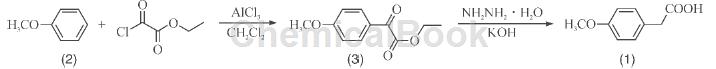 方法1:以甲醚(2)为原料,在a lcl3 催化下与草酰氯单乙酯发生friedel-c raft s 酰化反应生成对甲氧基乙酮酸乙酯(3),后者不经分离直接与水合肼发生wolff-kishner-huang 反应得到目标产物(1),总产率为55 .4 %。本合成路线所使用的原料廉价,无需使用昂贵及剧毒试剂,工业前景较好。具体的反应式如图所示。