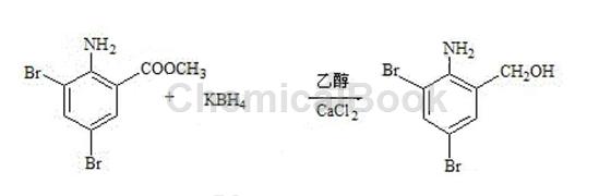 1)还原物的制备:往反应瓶中搅拌下投入乙醇200g,氯化钙50g,搅拌至全溶备用往另一反应瓶中投入乙醇200g加入3,5-二溴邻氨基甲酸甲酯100g,钾硼氢35g,常温下搅拌30分钟后,开始滴加氯化钙乙醇溶液,控制反应温度在40±2℃,2小时滴完滴毕,保温反应2小时。降温至25℃,控制温度25℃以下,缓慢加入15%盐酸200 kg,调节ph值至1-2,搅拌30分钟保持ph值,,冷却,抽滤,滤饼用饮用水冲洗,洗至中性,烘干。得还原物89g,白色或淡黄色粉末,熔点135~143℃。