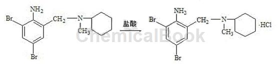 3)盐酸溴己新的精制 :向反应瓶内加入乙醇800g, 盐酸溴己新粗品100g、活性炭15g,开启搅拌,缓慢升温到回流,保持回流30min。回流结束后,降温至50℃以下,过滤,用少量乙醇冲洗净滤饼,合并洗液,滤液减压浓缩至1/2体积,缓慢降温至5~10℃,保持20分钟。 开始过滤。滤饼抽干后,再用少量乙醇淋洗湿品,继续抽干,烘干,得盐酸溴己新成品。为白色或类白色结晶性粉末。含量(hplc) ≥99.0%,熔点:235~243℃。