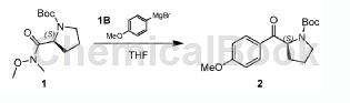 具体步骤为:将4-甲氧基基溴化镁ib(98.18g,464.55mmol)的thf溶液冷却至0℃,然后向混合物中加入化合物1(40.00g,154.85mmol)的thf(150.00ml)溶液。在n2气氛下将混合物在25℃下搅拌2小时。tlc表明化合物1完全消耗并形成一个新斑点。用饱和nahco 3水溶液淬灭反应。用etoac(100ml×3)萃取。洗涤合并的有机相用盐水(200ml×1),经无水na 2 so 4干燥,过滤并真空浓缩。通过柱色谱(sio 2,石油醚/= 100:1至20:1)纯化残余物。得到化合物2(28.00g,粗品),为白色固体。1h nmr(400mhz,cdcl3):δ= 8.00-7.88(m,2h),6.99-6.89(m,2h),5.35-5.09(m,1h),3.90-3.84(m,3h),3.72-3.38(m,2h),2.36-1.80(m,4h),1.52-1.13(m,9h)。tlc(石油醚:= 1:1)rf = 0.43。