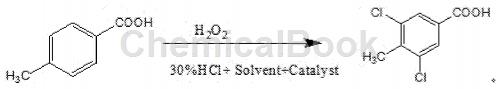 本发明提供了一种以对甲基甲酸为原料,通过氧化氯化反应,合成2,6-二氯对甲基甲酸的方法,具体包括如下步骤:首先将对甲基甲酸溶解在溶剂二氯中,接着依次加入钨酸盐催化剂,盐酸,进行升温,然后滴加双氧水进行氧化氯化反应,反应10个小时后,对反应液进行浓缩,再加入甲醇进行重结晶,得到产品2,6-二氯对甲基甲酸,