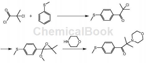 cn201810101151.4提供了一种自由基光引发剂的合成方法,此方法在合成过程中能有效降低生产成本,提高产品收率。本发明采用的技术方案如下:一种自由基光引发剂的合成方法,包括如下步骤:(1)在三氯化铝的作用下,以甲基基硫醚为原料,与2-氯异丁酰氯发生傅克酰基化反应,制得结构如式(ⅰ)所示的中间体a;(2)在碱的作用下,中间体a进行环合反应,制得结构如式(ⅱ)所示的中间体b;(3)中间体b与吗啉进行开环反应,得到结构如式(ⅲ)所示的目标产物,即所述的自由基光引发剂。本发明方法采用2-氯异丁酰氯与甲基基硫醚进行傅克酰基化反应,再经环合、开环等步骤合成光引发剂,得到的产物杂质少,收率高,这一工艺路线操作方便,产生的三废量少,对环境更友好。本发明自由基光引发剂的合成路线如下: