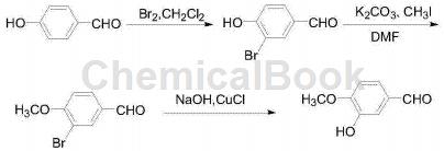 异香兰素别名异香兰醛,亦称异香荚兰素,化学名3-羟基-4-甲氧基甲醛,为白 色或淡黄色晶状粉末或针状结晶,熔点116~117℃,沸点179℃,具有香荚兰豆香气及浓郁 的奶香,是食品添加剂行业中不可缺少的重要原料,可作为香料、香精、食品及化妆品添加 剂,同时还用作植物生长调节剂及药物中间体。cn201710330196.4提供一种原料价廉易得、各步产物收率高、操作 简单以适于工业化生产的异香兰素的合成新工艺。本发明所要解决的技术问题采用以下的技术方案来实现:一种异香兰素的合成新工艺,以4-羟基甲醛为原料,先与溴素反应得到3-溴-4- 羟基甲醛,再与碘甲烷反应得到3-溴-4-甲氧基甲醛,然后在氢氧化钠与氯化亚铜作用 下经水解制得异香兰素。