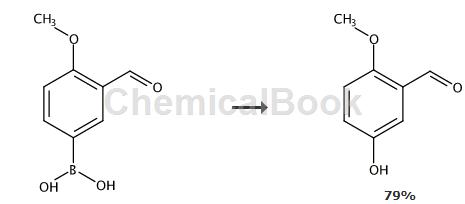 在装有磁搅拌子的圆底烧瓶中加入氧化亚铜0.0144g(0.1mmol),nh3-h2o 0.192ml(2.5mmol),3-醛基-4-甲氧基硼酸0.180g(1mmol),氢氧化钠0.2g(5mmol),2ml水。在15℃下,开放体系,反应时间为24小时。反应完成以后,加入盐酸调ph值到2-3,用进行萃取3次,每次10ml,合并的有机相经浓缩分离纯化,得到2-甲氧基5-羟基甲醛120mg,产率为79%。